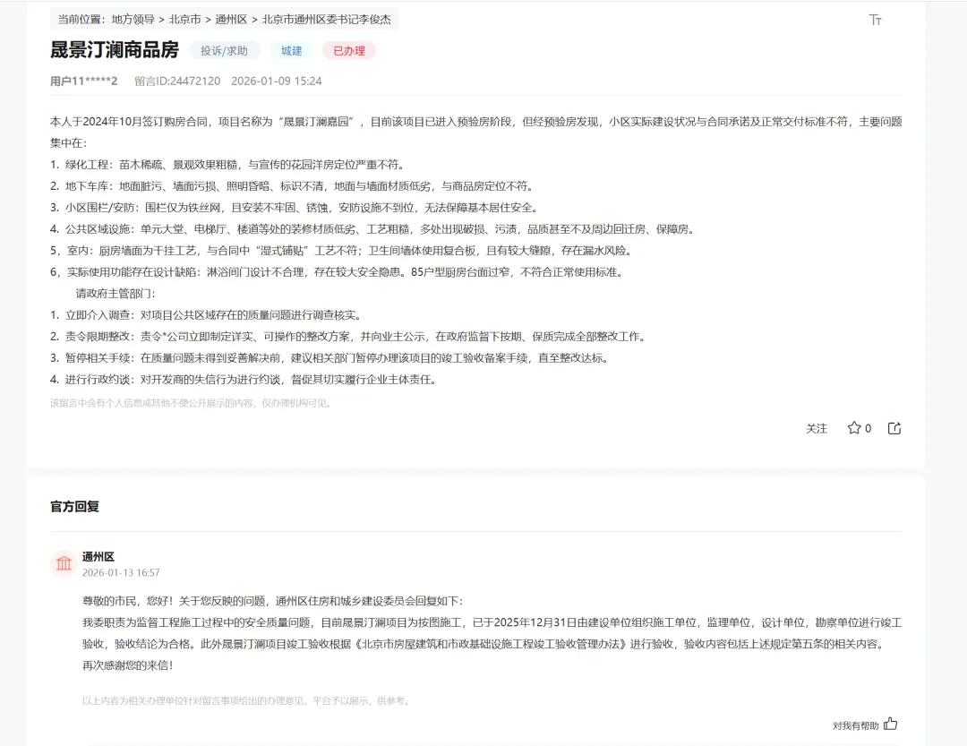 尽管北京市通州区住房和城乡建设委员会在回应中表示,“晟景汀澜的验收合格”,也未能打消购房者疑虑。此后,抖音等平台上先后出现了多个该项目的验房视频,均称其精装修存在质量问题。